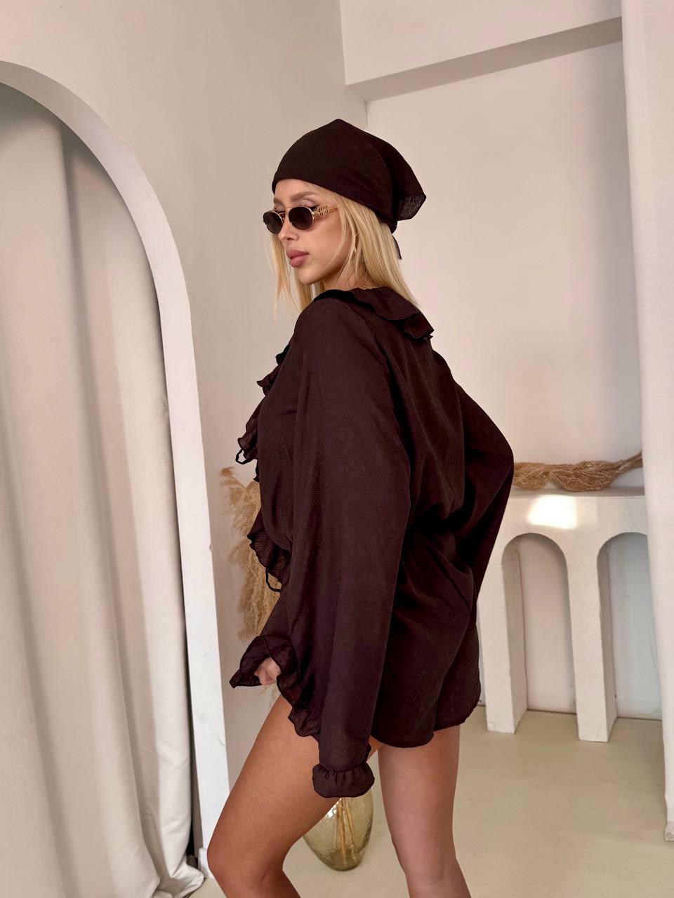 Lucca Czekoladowy kombinezon z delikatnymi falbanami, głębokim dekoltem i efektownym wiązaniem z przodu