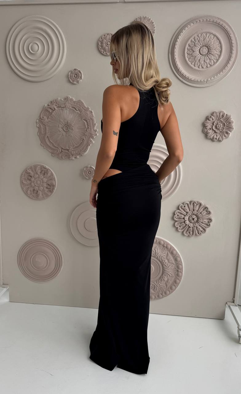 Body z wycięciami na ramionach i małym golfem podkreśla sylwetkę i dodaje szyku.Długa spódnica, marszczona przy pasie, z ukośnym krojem u góry, tworzy idealne proporcje i pięknie układa się w ruchu. Świetnie komponuje się zarówno ze szpilkami, jak i wygodnymi klapkami – idealny wybór na letnie spacery i eleganckie wyjścia!