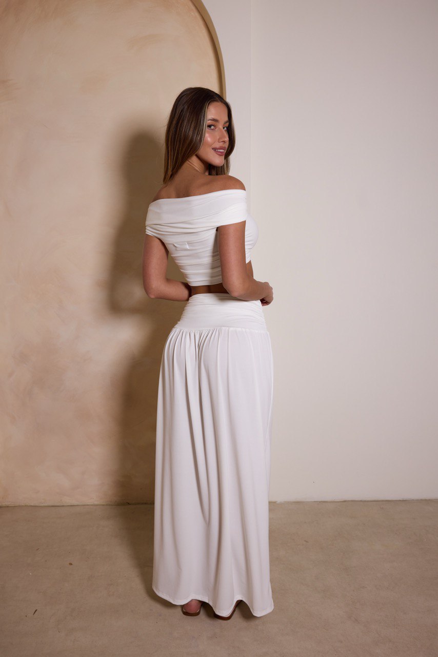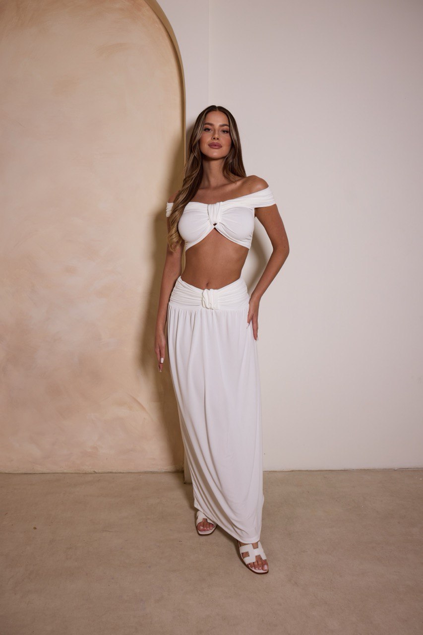 Elegancki, kobiecy komplet Samani o wyjątkowym charakterze. Krótki top z efektownym splotem pomiędzy piersiami i opuszczonymi ramionami w połączeniu z długą spódnicą z marszczeniem na biodrach tworzy niezwykle zmysłową sylwetkę. Splot w pasie nawiązuje do detalu na topie, a szeroki dół spódnicy dodaje całości lekkości i elegancji