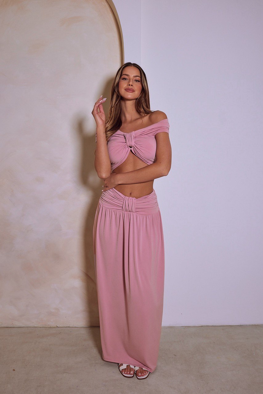 Elegancki, kobiecy komplet Samani o wyjątkowym charakterze. Krótki top z efektownym splotem pomiędzy piersiami i opuszczonymi ramionami w połączeniu z długą spódnicą z marszczeniem na biodrach tworzy niezwykle zmysłową sylwetkę. Splot w pasie nawiązuje do detalu na topie, a szeroki dół spódnicy dodaje całości lekkości i elegancji