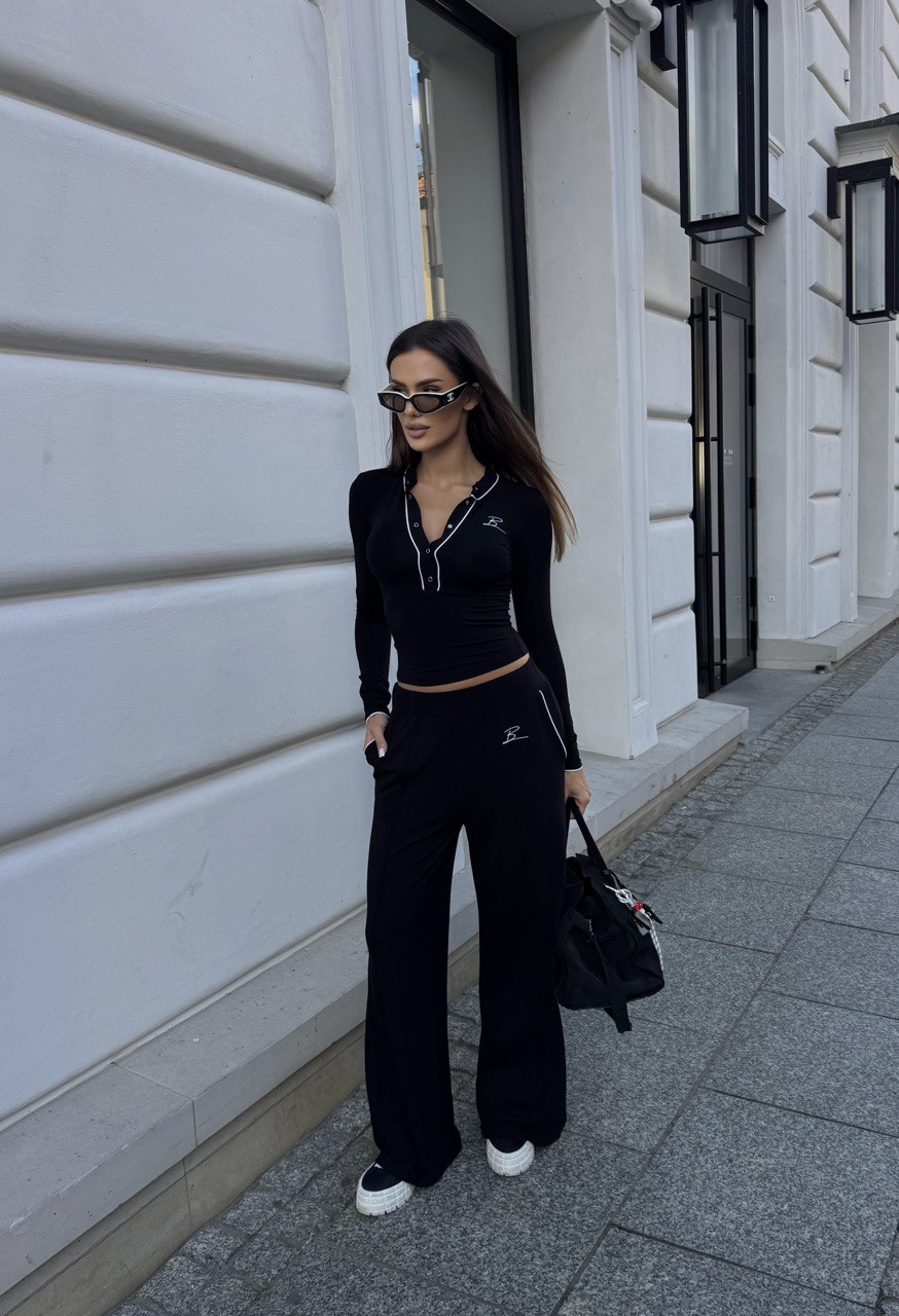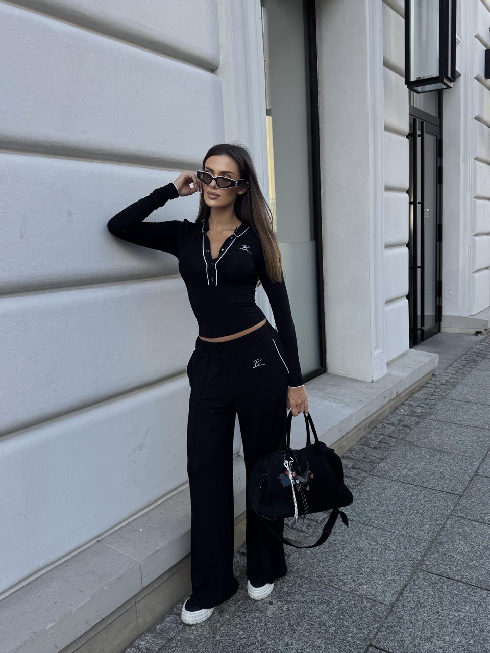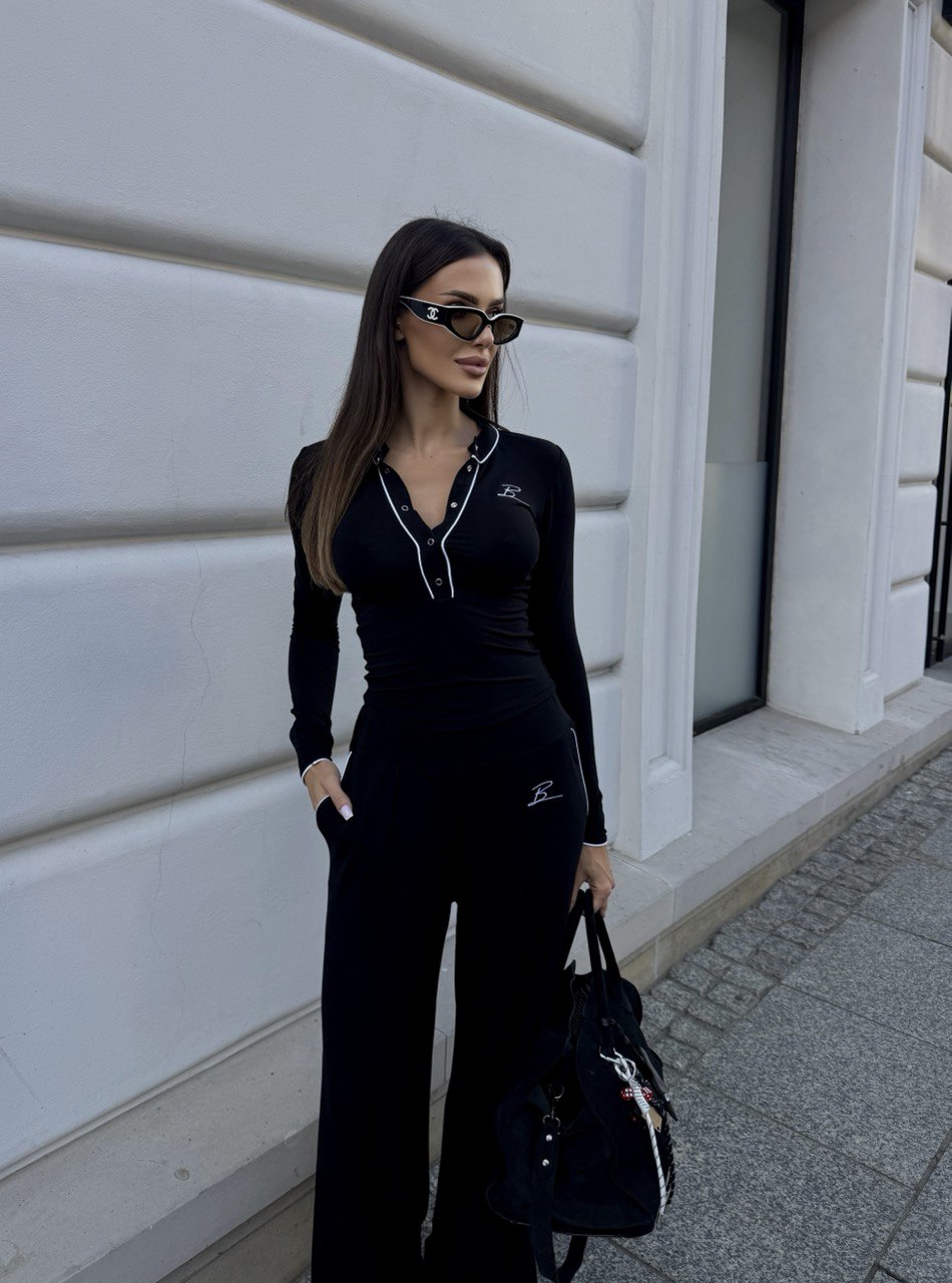 Set Lumen w głębokim odcieniu czerni z kontrastową lamówką, która dodaje mu wyjątkowego stylu. Dopasowana bluzka z długim rękawem i guzikami oraz spodnie z szeroką nogawką i kieszeniami ozdobione są delikatnym logo – zarówno na bluzce, jak i na spodniach. Idealny wybór na codzienne stylizacje w eleganckim, nowoczesnym wydaniu.