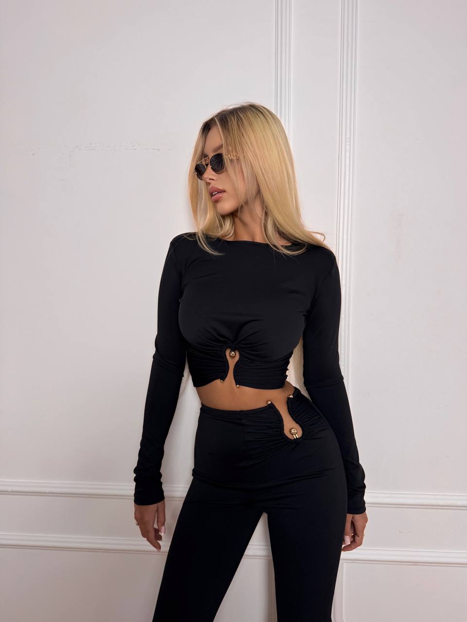 Total black moment 🖤 Set Syros , który podkreśla sylwetkę: dopasowany top z efektownym marszczeniem i metalową ozdobą oraz spodnie z wysokim stanem, subtelnym wycięciem i metalowym detalem. Minimalizm przełamany biżuteryjnym akcentem – robi efekt wow bez wysiłku.
