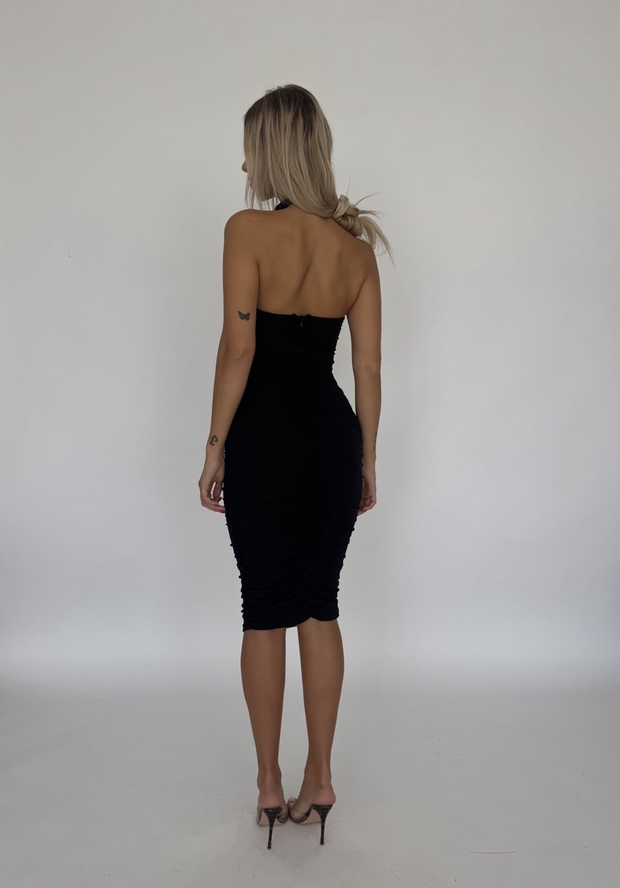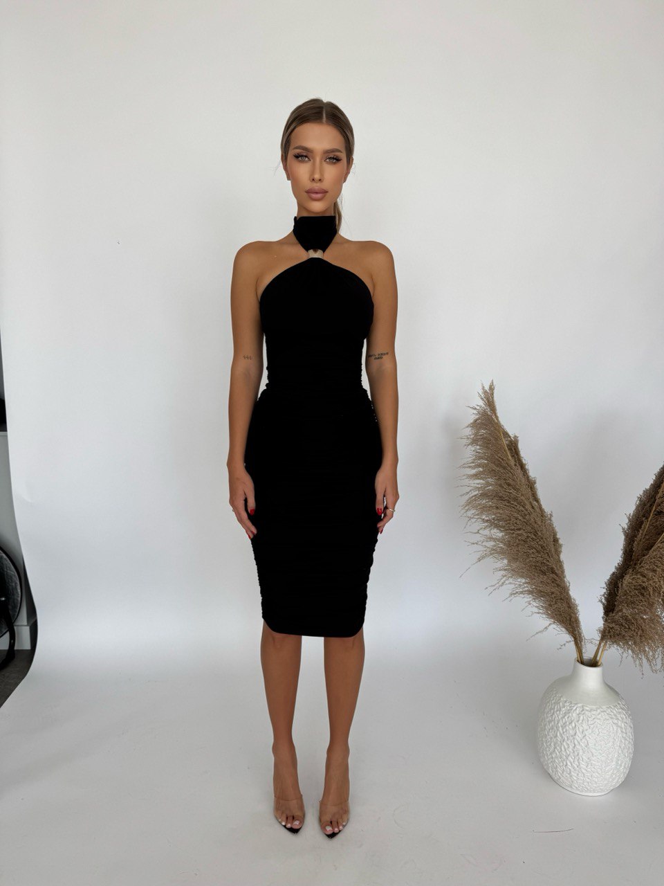 Dopasowany fason podkreślający sylwetkę Marszczenia po bokach i z tyłu dla idealnego dopasowania Odkryte ramiona dodające elegancji Zapięcie na szyi i ozdobny metalowy detaldaje szyku i pozwala dopasować stylizację do każdej okazji.