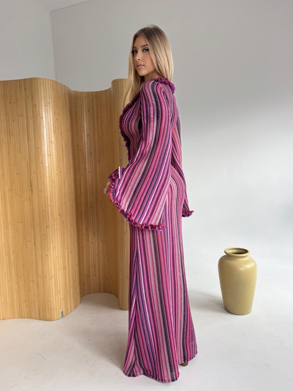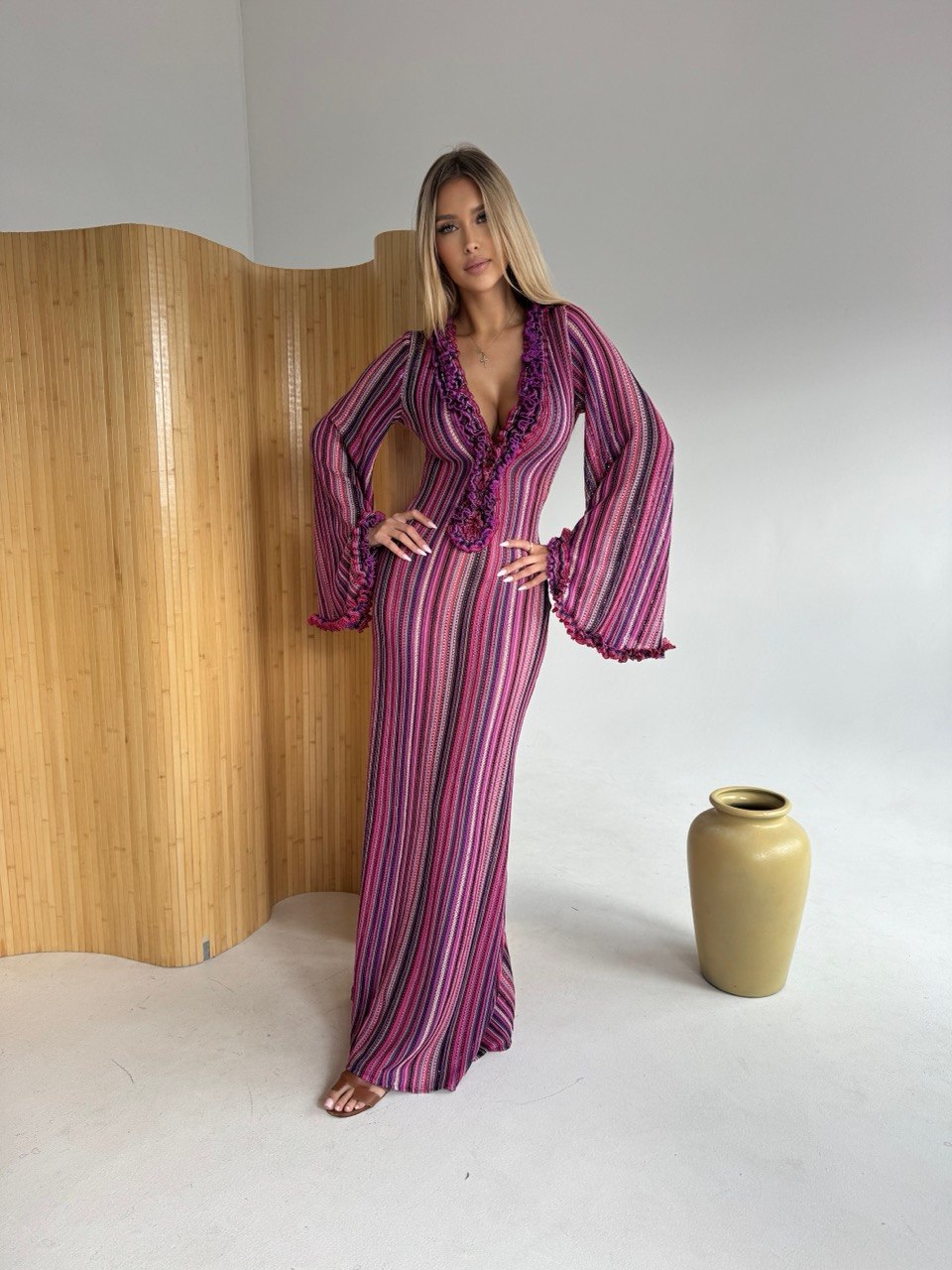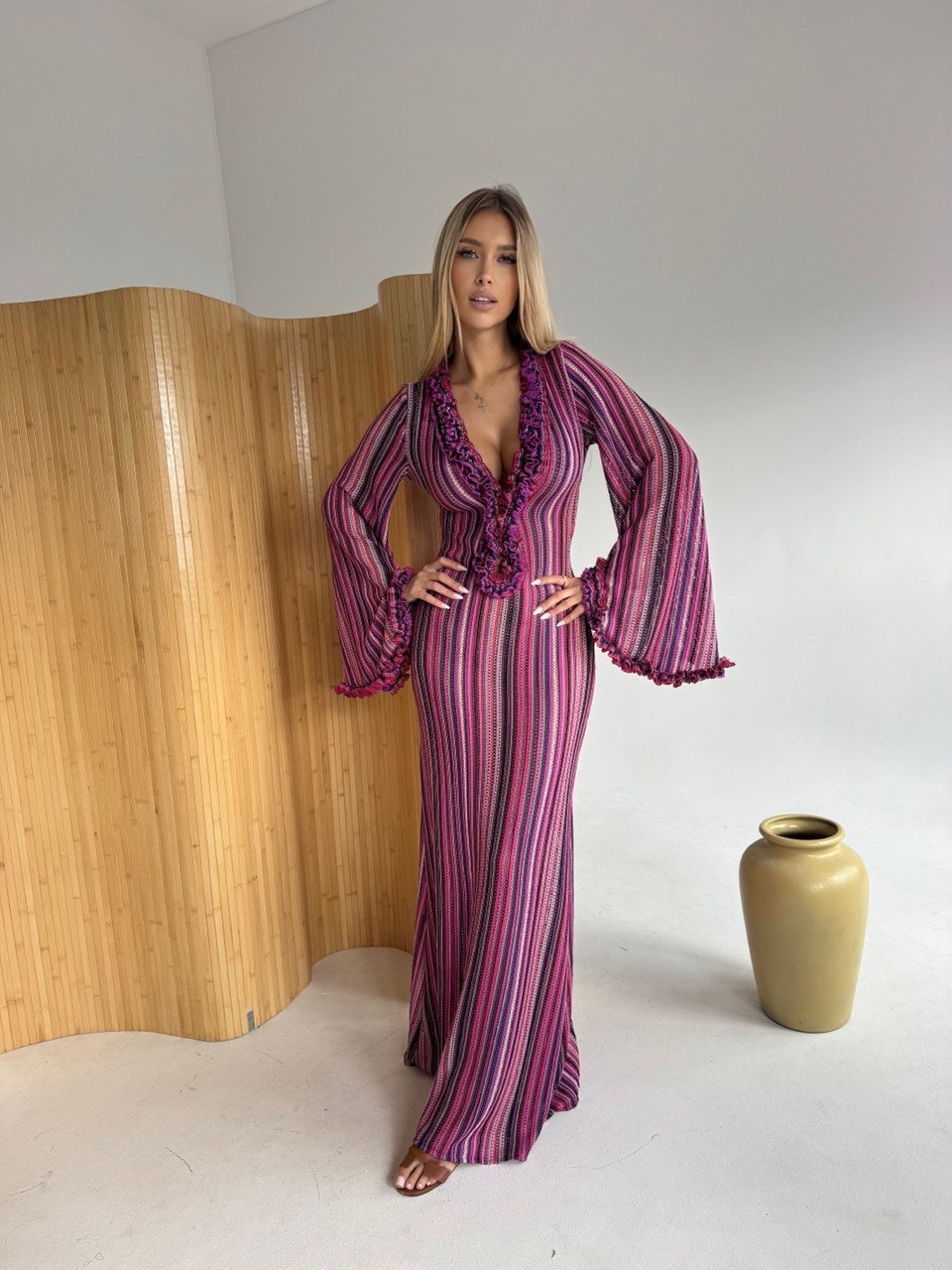 Gaia długa , ażurowa sukienka w odcieniu subtelnego fioletu, która idealnie podkreśla sylwetkę. Model z głębokim dekoltem wykończonym romantyczną falbanką oraz efektownym wiązaniem na biuście. Detale, które robią różnicę: