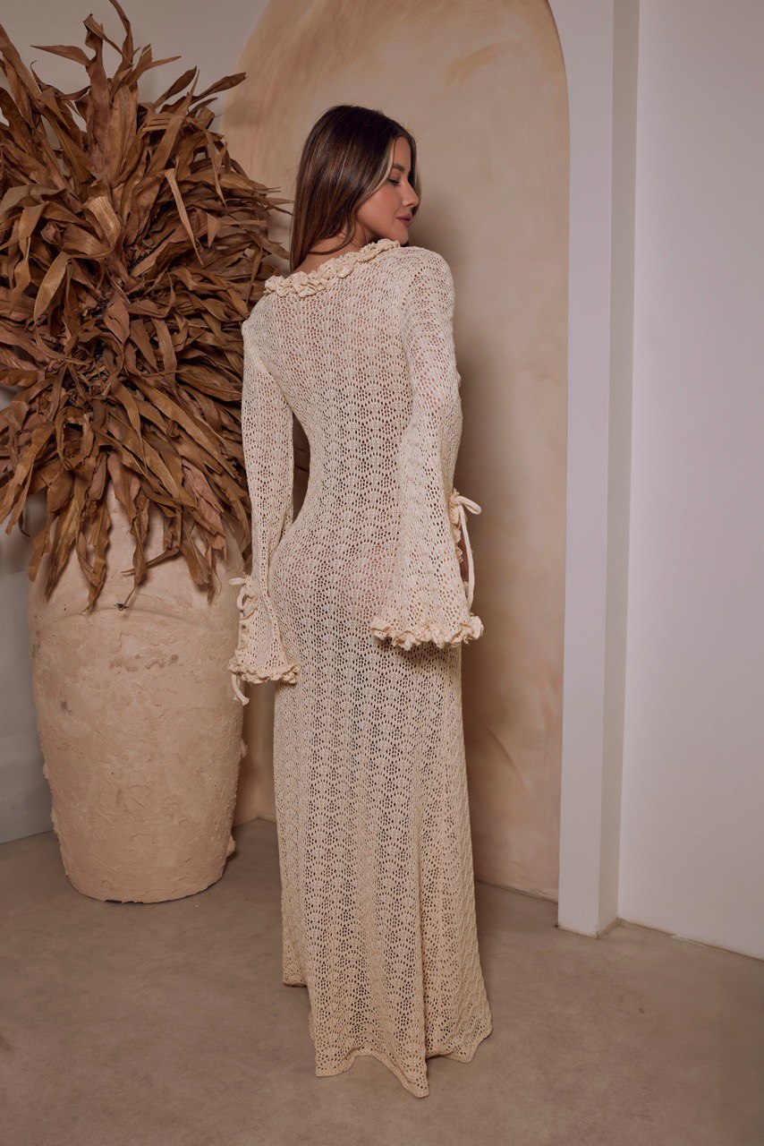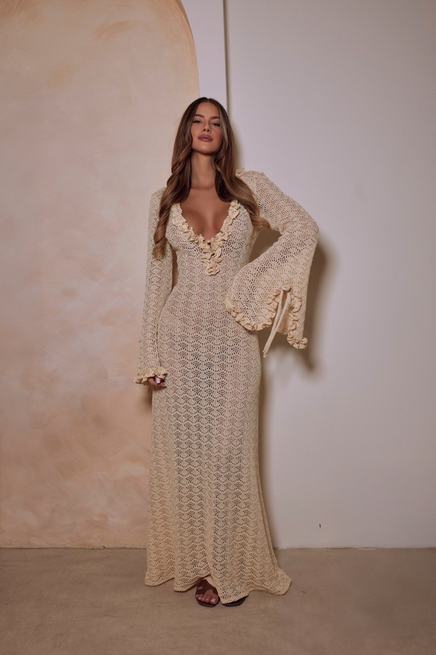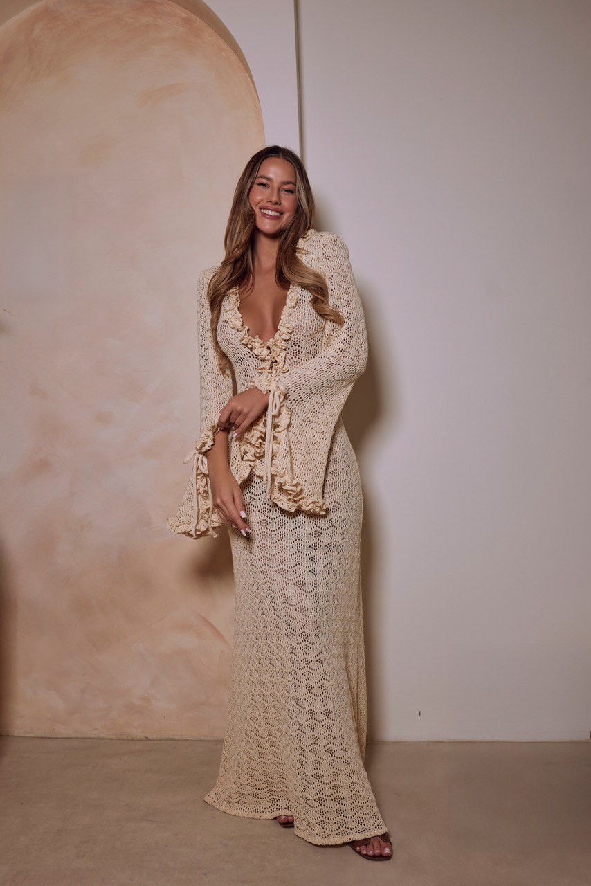 Gaia długa , ażurowa sukienka w odcieniu subtelnego beżu, która idealnie podkreśla sylwetkę. Model z głębokim dekoltem wykończonym romantyczną falbanką oraz efektownym wiązaniem na biuście. Detale, które robią różnicę: